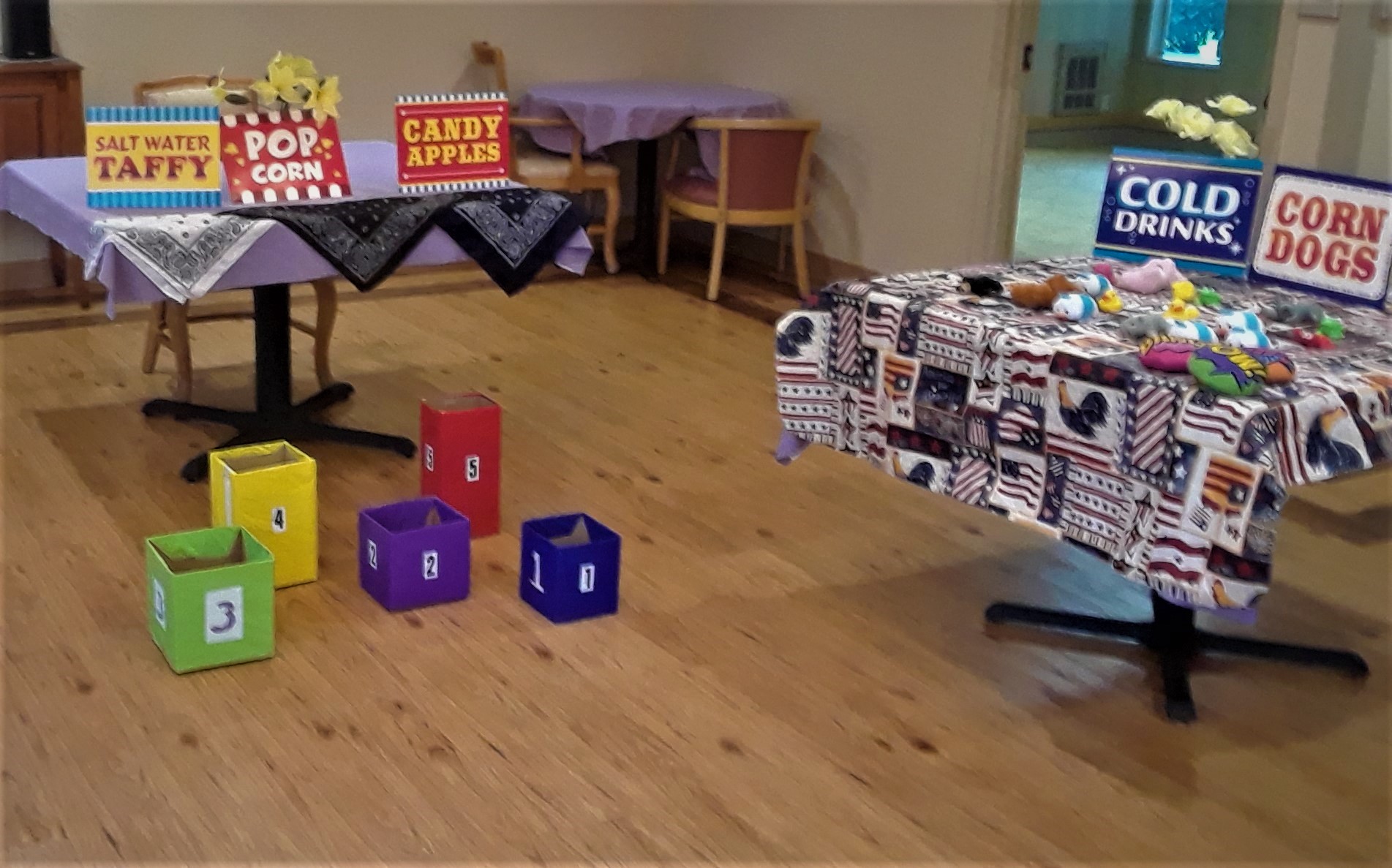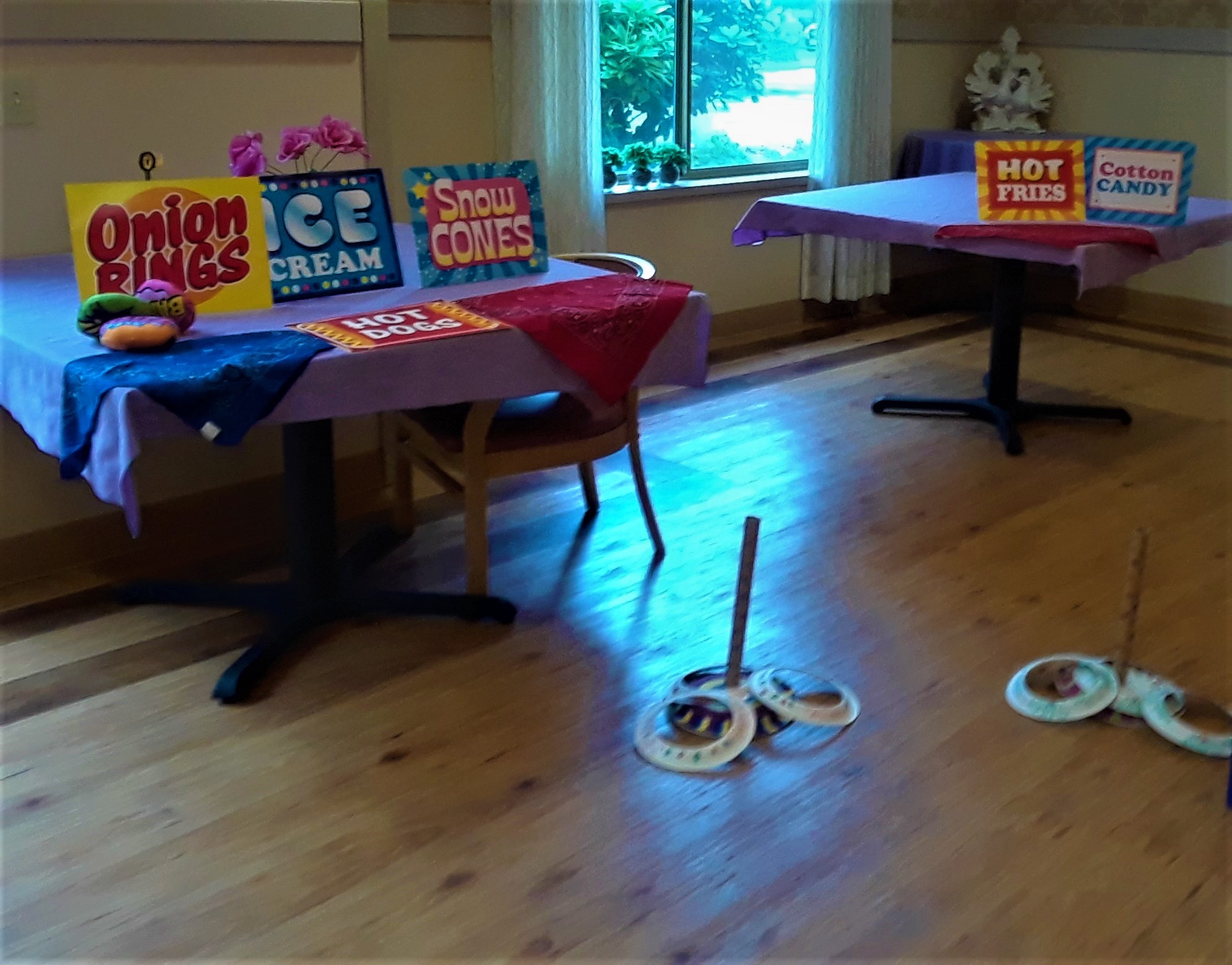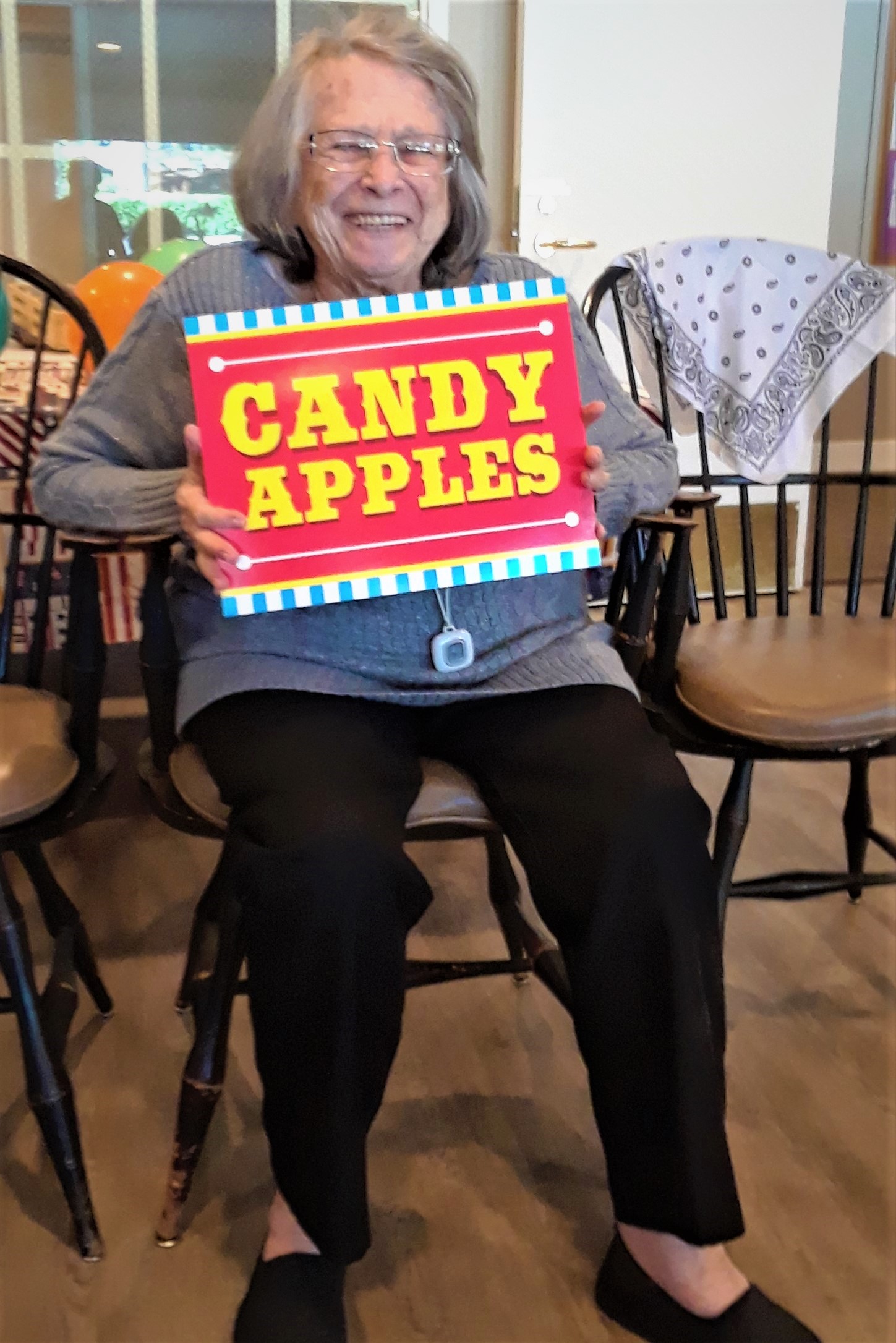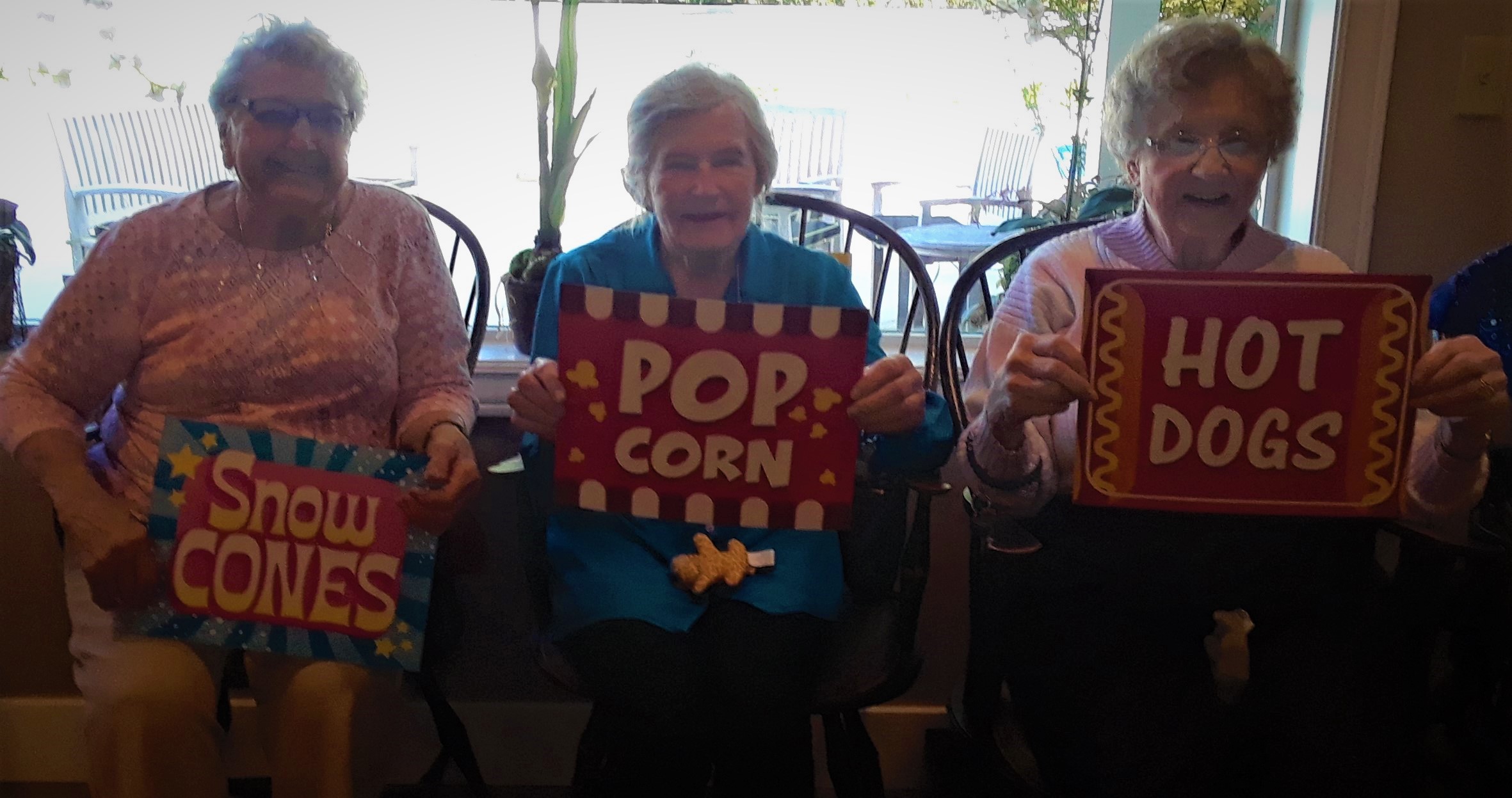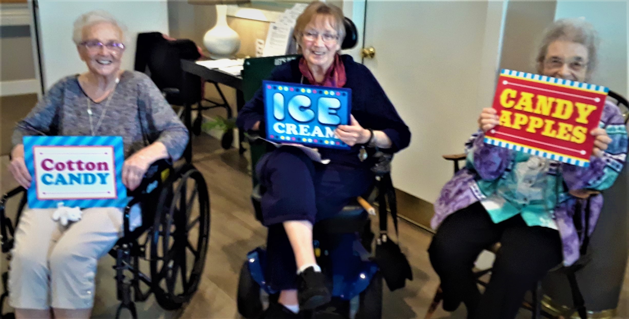 With it being being Washington State Fair month, the Wiser Home Care Services Music Affects Program in September was so much fun. We brought a little of the State Fair to the wonderful, lively residents and staff of the Weatherly Inn of Tacoma and Canterbury House of Auburn. We all enjoyed wonderful State Fair music while playing Ring Toss, Bean Bag Toss and Balloon games. We shared memories of our favorite rides, food and exhibits that the fair has to experience. Some residents gracious enough to allow us to take their photos can be seen here with a sign that features their favorite fair foods.